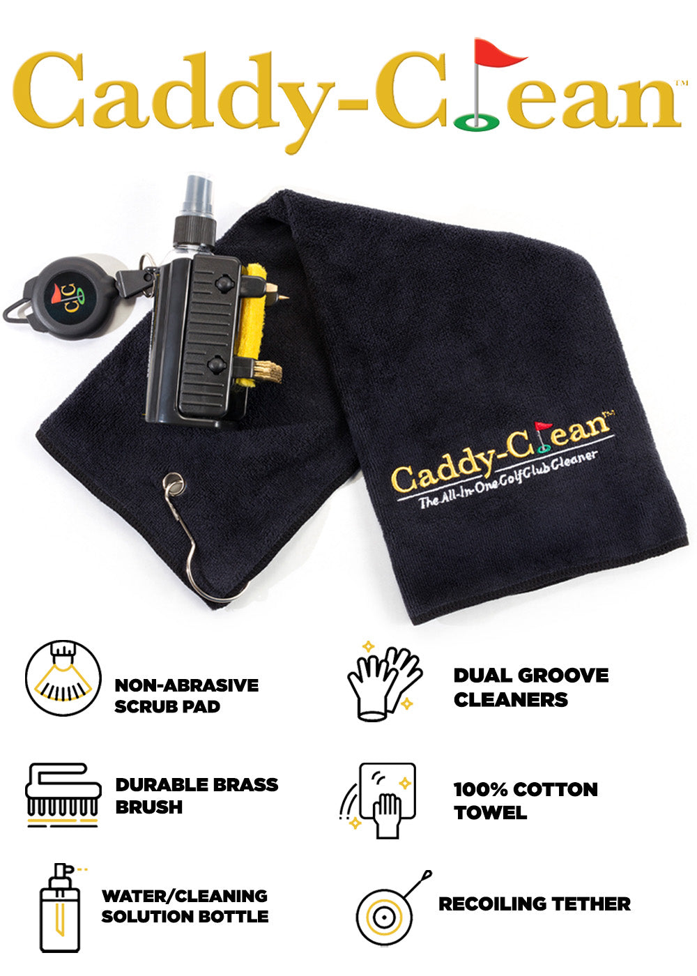 Elevate your golf game with The Caddy-Clean, the ultimate all-in-one golf club cleaner. This compact and efficient tool attaches to your golf bag, providing quick and easy access with its recoiling tether. Its non-scratch scrub pad, flat and pointed brass groove cleaning tools, and premium cotton golf towel ensure your clubs stay in optimal condition. The Caddy-Clean is designed for golf enthusiasts who demand the best from their equipment. Keep your clubs in pristine condition and consistently perform at your best. Get your Caddy-Clean today, and enjoy effortless club maintenance for an enhanced golfing experience.